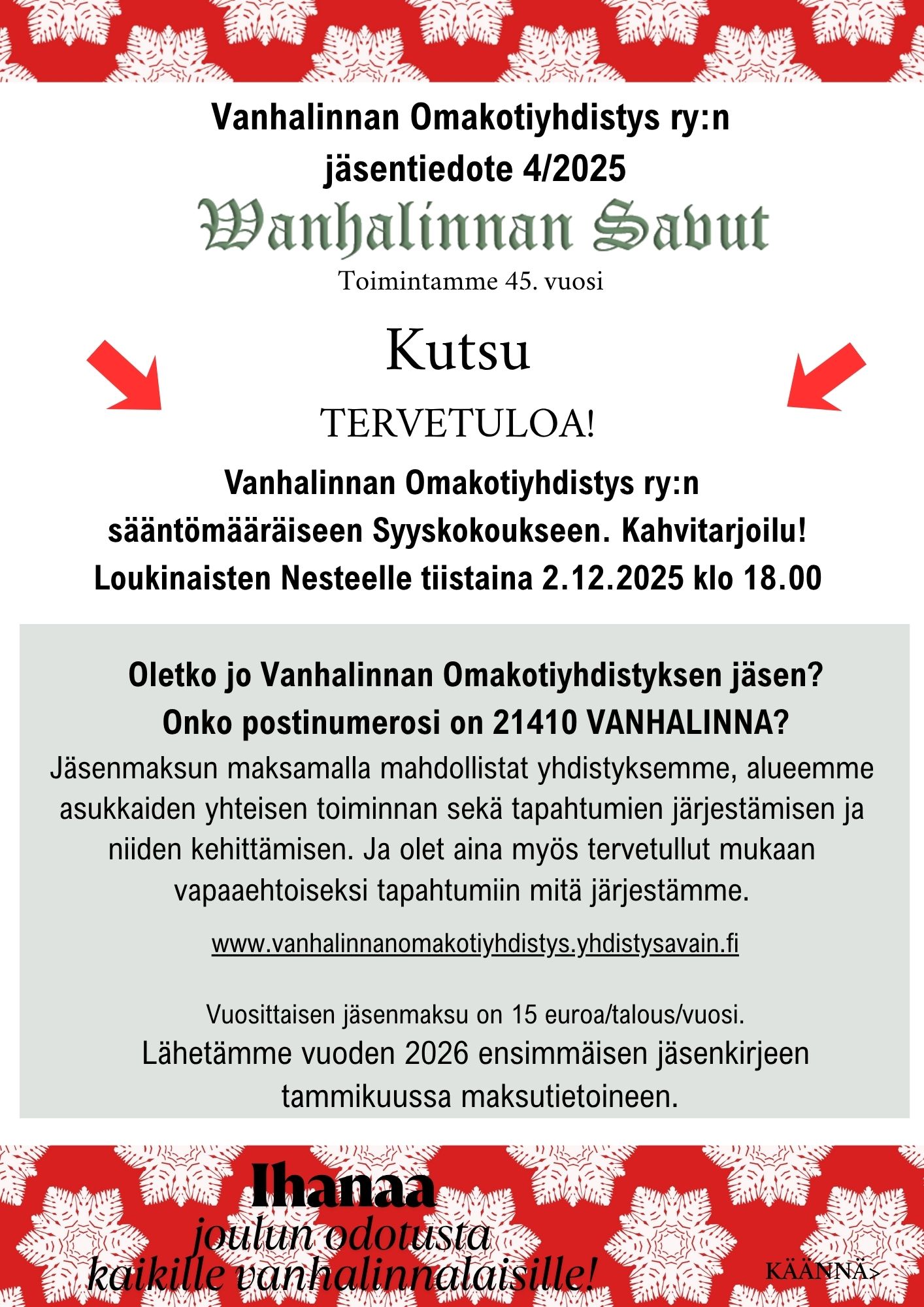 Lämpimästi tervetuloa Vanhalinnan Omakotiyhdistys ry:n sääntömääräiseen syyskokoukseen TI 2.12.2025 klo 18:00 alkaen Liedon Nesteelle.
